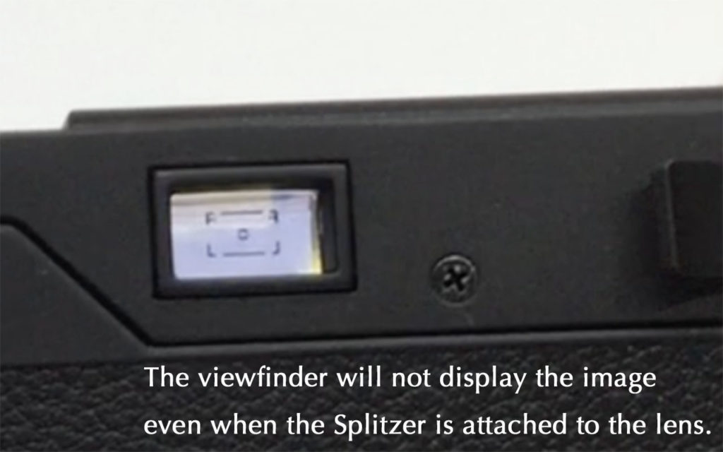 スプリッツァーをレンズに装着をしてもレンズとビューファインダーは連動をしていないために、ビューファインダーではレンズがスプリッツァーで覆われているようには見えません。例えばレンズの上半分をスプリッツァーで覆っていても、ビューファインダーでは通常通り全面で見えています。そのためにどれほどスプリッツァーで覆われるかはご自身でイメージする必要があります。