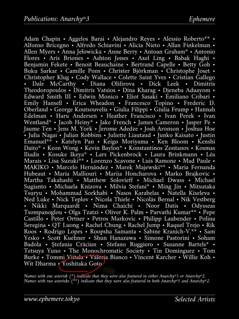 このたび、モノクロ写真集『Anarchyº3』に私の作品も選出され、掲載されました。Ephemere が展開するブラック&ホワイト写真シリーズ三部作の最終巻となる本書には、1,000点以上の応募の中から選ばれた、世界25カ国・143名の写真家が参加しています。多様なモノクロ表現が交差する一冊の中に、自分の作品を加えられたことをとても光栄に思います。世界発送は2026年3月中旬より開始予定です。 詳細はこちらのサイトをご覧ください。