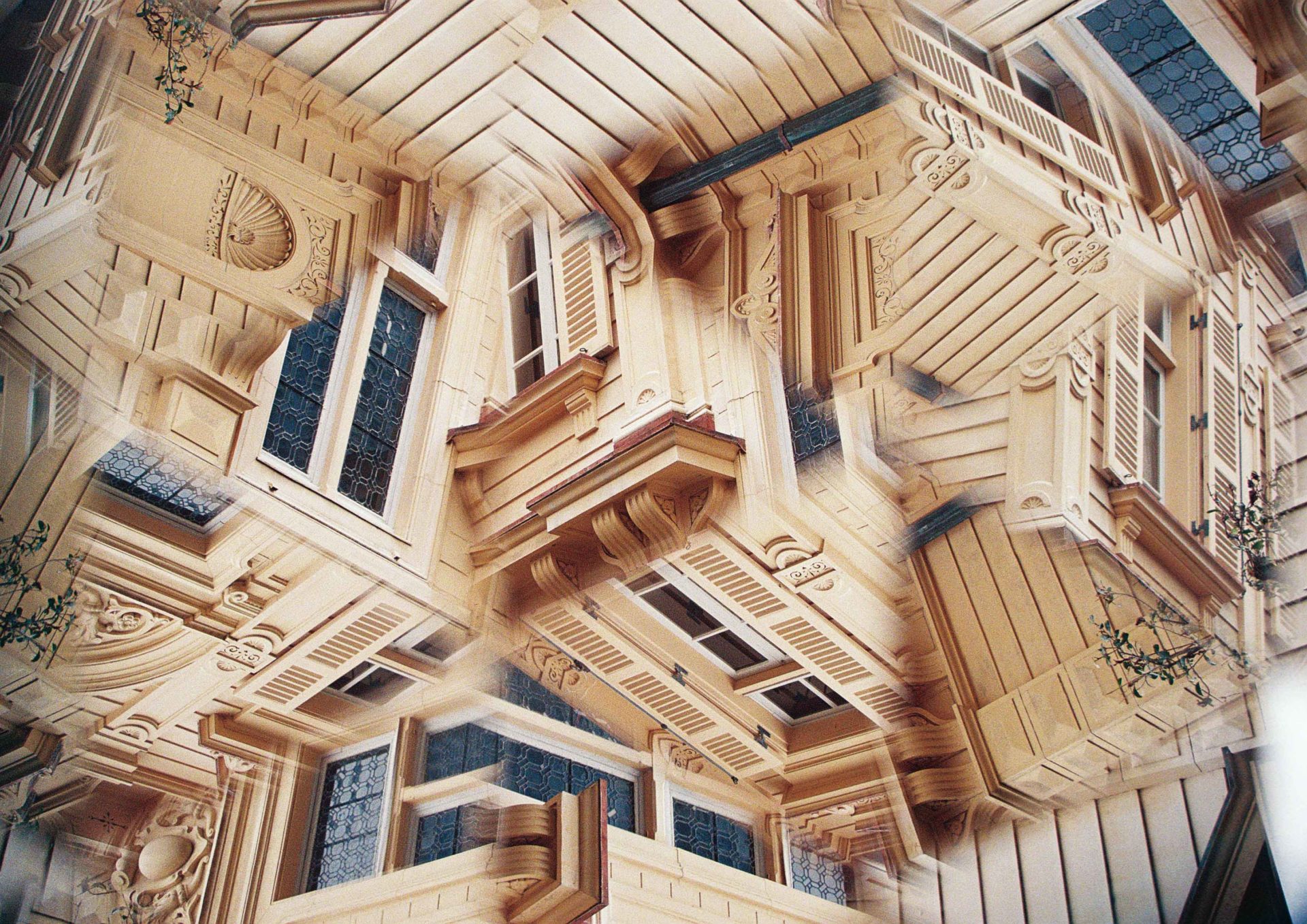 コラージュのような幻想的なイメージはデジタル編集のように見えますが、これらはすべて万華鏡レンズがもたらす効果です。通常のカメラレンズの前にこの特殊なレンズを装着すると、ファインダー越しの景色が万華鏡のように美しい対称模様へと変わります。